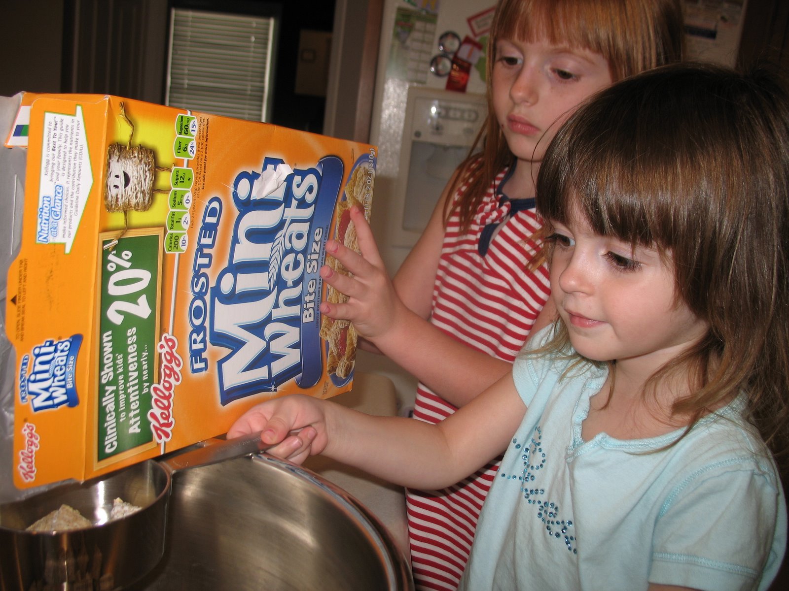 As part of this promotion, the folks at Kelloggs and Mom Central supplied us with two boxes of Kellogg’s Frosted Mini Wheats and some recipe ideas. After reviewing the various recipes, we decided to create a trail mix that called for Frosted Mini Wheats, pretzels, peanuts, raisins, peanut butter and Karo syrup.