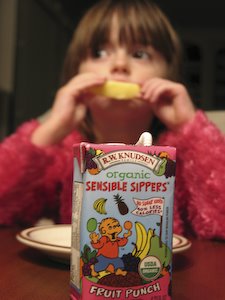 Then last week, we received a sample of Sensible Sippers from R.W. Knudsen Family. They carry the USDA “Organic” label, have 40% less calories than regular apple juice and have no added sugar. We received samples of the Fruit Punch and the Apple. (Also available in Mixed Berry and Banana). At snack time, I asked the girls if they wanted a new juice box with their apple and they both jumped at the chance. Miss M picked apple juice while Miss K chose the fruit punch flavor.