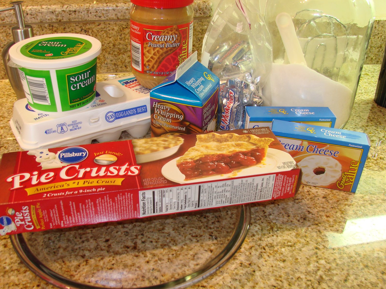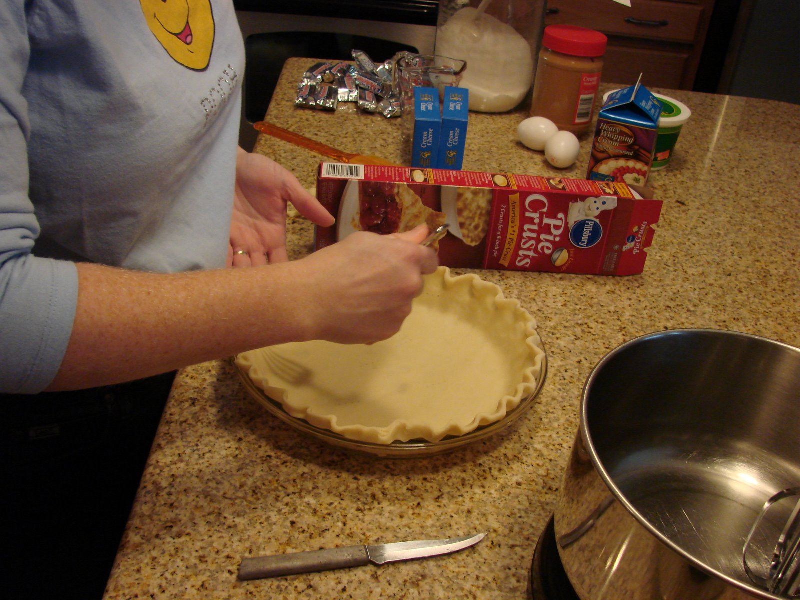 Anyway, the package I received from Pillsbury included two 9″ glass pie dishes, adorable Christmas cutouts, a pie server and a CD of recipes. We browsed the recipes and found a candy bar one that sounded good. We purchased the ingredients then went at it.