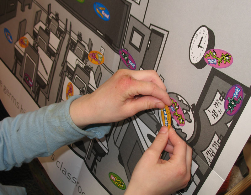 After infecting the class, Mr. KT read the kids a book called “Germs! Germs! Germs!” that he had checked out from the school library. Utilizing a poster of a sample classroom that was in the kit provided by Clorox, he had the kids affix stickers to the poster in areas of the classroom that they thought might contain germs.