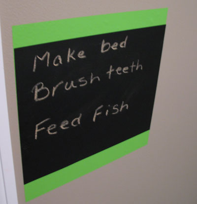 The panels are removable and reusable so I decided to put them to use in a temporary location until the basement is finally finished. Here’s a picture of the one that’s in the girls’ bathroom – the To Do list of the three things I expect from them each morning.