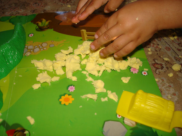 Once we opened the box, with excitement, Little Ms. A couldn’t wait to get her hands on the dough. She didn’t let me squish and squash the dough to get it ready for her. She wanted to play right away. As she played with the dough, I assembled the barn together for her. It was very easy to put together so she could get right to it. I was pleased with how quickly the assembly process went.