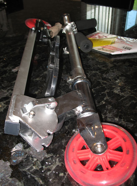 What’s so different about the Shox Scooter? The base of it, the part that you stand on, isn’t just a flat board like a modified skateboard. It has a built in spring-y thing-y. Yeah, it’s probably a shock absorber hence the name “Shox” Scooter. But I have no intention of getting all technical like that on my blog. At least not today. When I look at it, I think of those clicker toys that we played with growing up that you. Am I dating myself age-wise or do kids still play with those? Nevermind. Basically, it’s bouncy. When you watch kids doing tricks with their skateboards and scooters, they tend to ‘hop’ them to be able to do various tricks. The Shox Scooter has the spring built in to make doing tricks even easier.