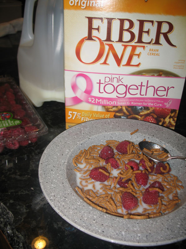 Guess what. It was heavy and filling. While normally I would fill a cereal bowl and eat it and this time was no different. As you can see from my photo, I filled up the cereal bowl with fruit and Fiber One. About halfway through, I realized that all I needed was a tea cup full. Each subsequent time, I ate less but was still plenty satisfied. It kept me moving during my class at the gym, too whereas toast and other cereals sometimes don’t agree with me half way through the class.