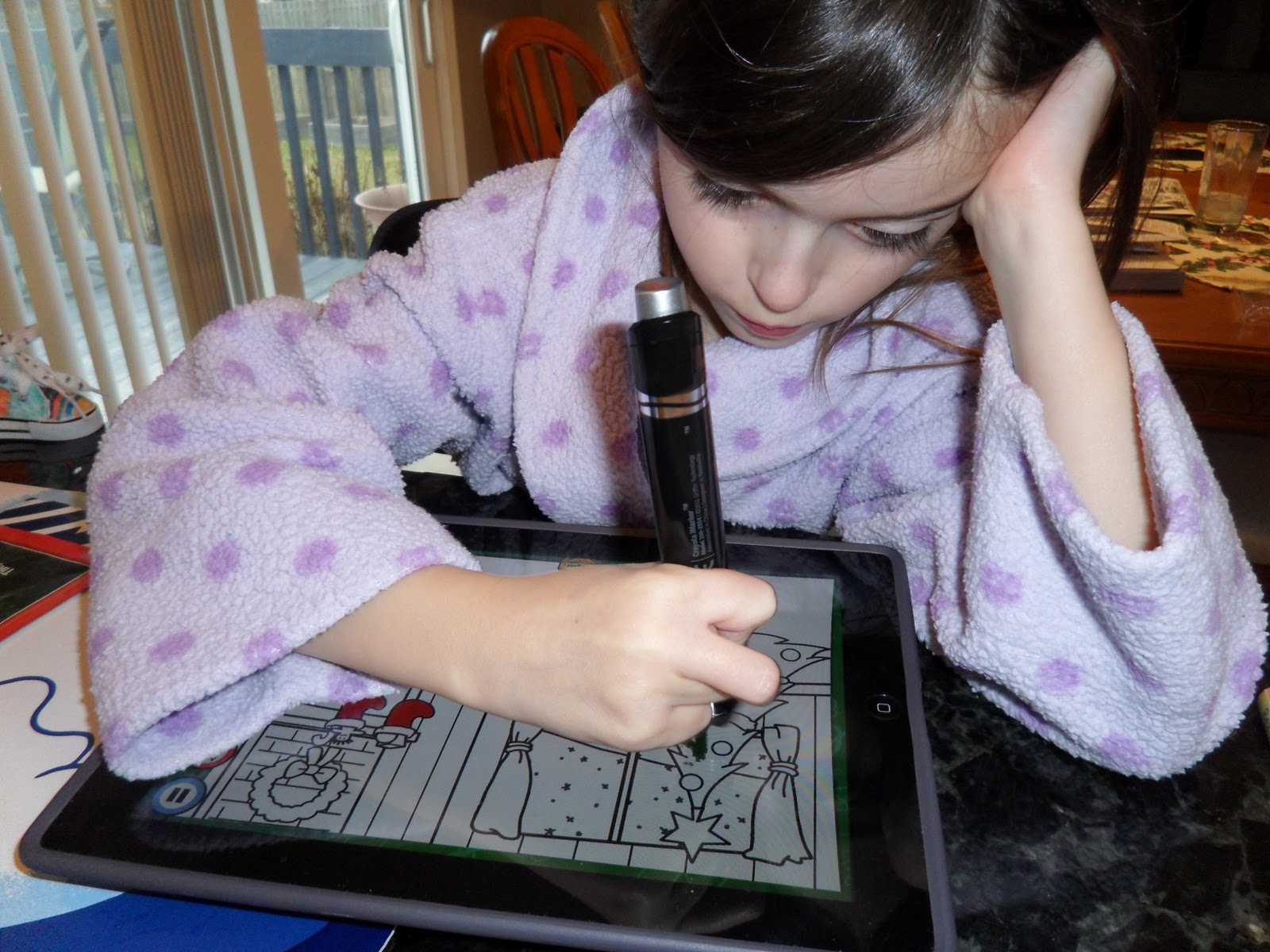 Because I was trying to do a review of the product, I set myself down to test it out.  I pulled up a Christmas scene and started at it. It was therapeutic at a time when I definitely needed it.  The app isn’t just a bunch of pages to color/erase/start over.  They’re animated.  I was coloring a fire and the fire kept moving.  As I finished coloring an empty stocking, it magically transformed and now contained presents.  Then you know what happened?  Someone… who shall remain nameless… insisted she take over my project.  I wasn’t too thrilled with that because I was having a lot of fun.