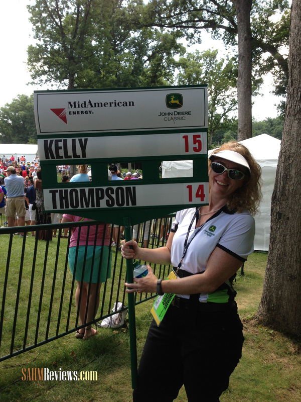 After spending time around the grounds, we headed to our check-in. We arrived at the first hole and were introduced to Leanne, the sign holder for our group. I asked her if I could snap a quick picture of her with the sign and she promptly handed it to me and took my camera. We were in a hurry at this point so unfortunately, I didn’t have time to get my dad into the photo. All that excitement and we haven’t even met the golfers! At the first tee, Nick came up and introduced himself. When Jerry arrived, I heard him ask if there were any Honorary Observers and he turned and greeted us, shook our hands and welcomed us. Before tee-off, we were introduced to the gallery and had our picture taken with the trophy. I’m hoping they mail us the photo because we didn’t receive it onsite. The trophy was cool but I loved the markers for where the golfers tee off. They were little tractors and they were on every hole. It’s the John Deere Classic… of course there would be tractors!
