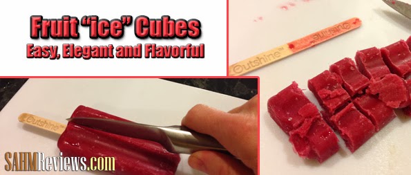 While I was chopping it up for the kids, I had a great thought. Chopped up fruit bars would be great in a drink! By cutting down the middle, I was able to free the stick very easily and cube the entire bar into fruit “ice” cubes.