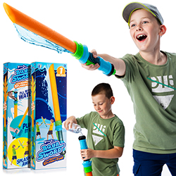 Aqua Sword is a soft foam sword that fills with water, letting kids duel while splashing their opponents. Swordplay leaves a fun water mark on clothing, adding a whole new level of excitement to any backyard barbecue or pool party. Just fill with water, draw your swords, and leave your mark on all the players as it squirts on impact! It’s a user-friendly pool toy and yard game that makes outdoor games for kids seamless and hassle-free. Made from soft sponges and flexible foam, like a pool noodle, it only delivers gentle hits and is soft enough for safe play yet sturdy enough to handle energetic swings, giving parents peace of mind.