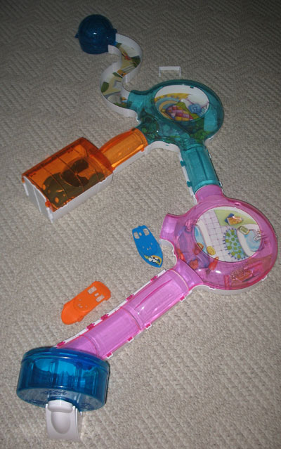 Which leads me to one of the things that I didn’t like about the Zhu Zhu pet setup… Assembly itself is very easy if you’re focused and don’t have two extra sets of miniature hands trying to help. But it’s large when you start incorporating so many modules onto it. Granted, the system is workable with only a few of the sections or can be assembled in different ways to accommodate different play areas. Honestly, unless you have a dedicated area for the kids to play in, this is not an easy “assemble, use, disassemble, store” toy. If your child has outgrown the train table, pack up the train set and put Zhu Zhu pets on it instead. That gives you an idea of the size of the unit when multiple modules are attached.